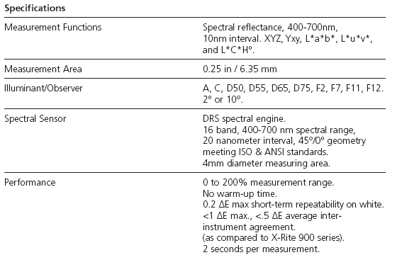 • Measures a wide variety of color samples 1/4" or larger including paper, plastic, fabric, painted surfaces and many others.
